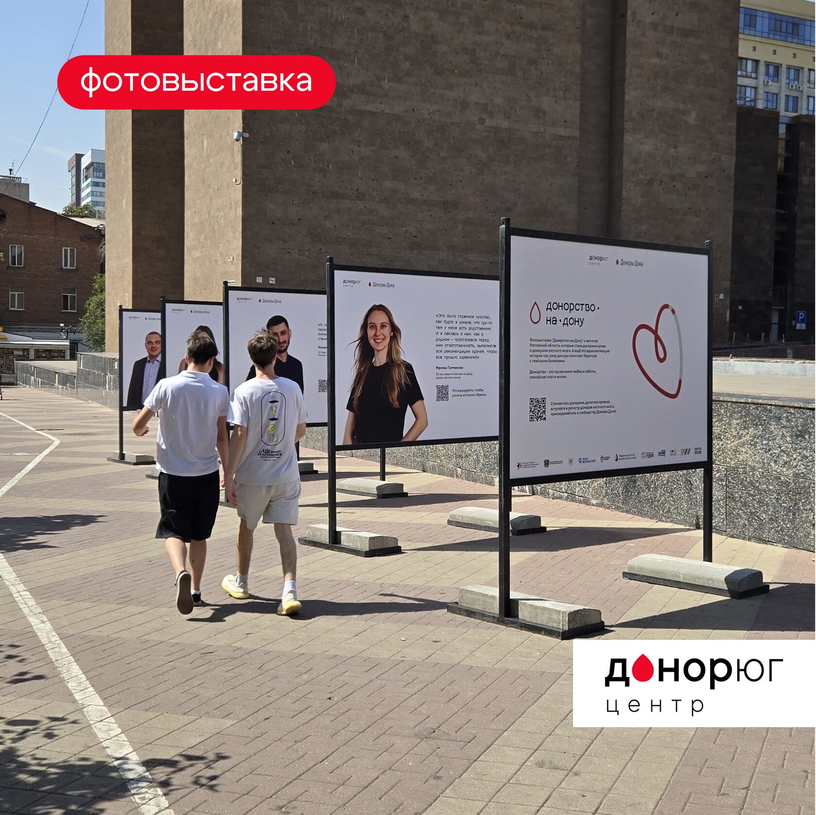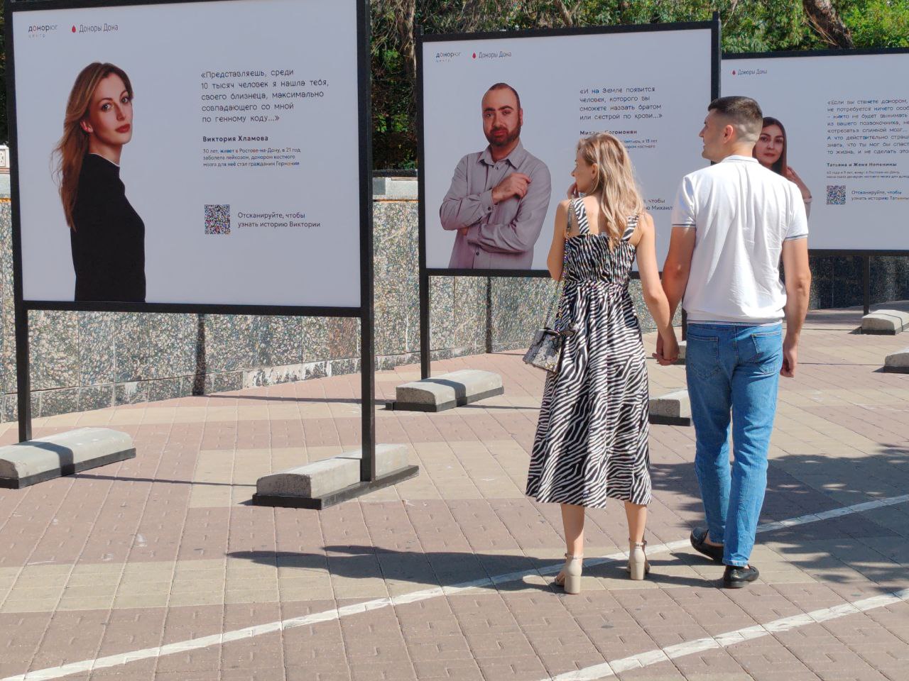 Уличный фотопроект «Донорство-на-Дону» расположился на улице Пушкинской перед Донской государственной публичной библиотекой. Каждая фотография проекта – это вдохновляющая история донора крови или донора костного мозга из Ростовской области, а также людей, которые благодаря помощи доноров победили тяжелую болезнь.